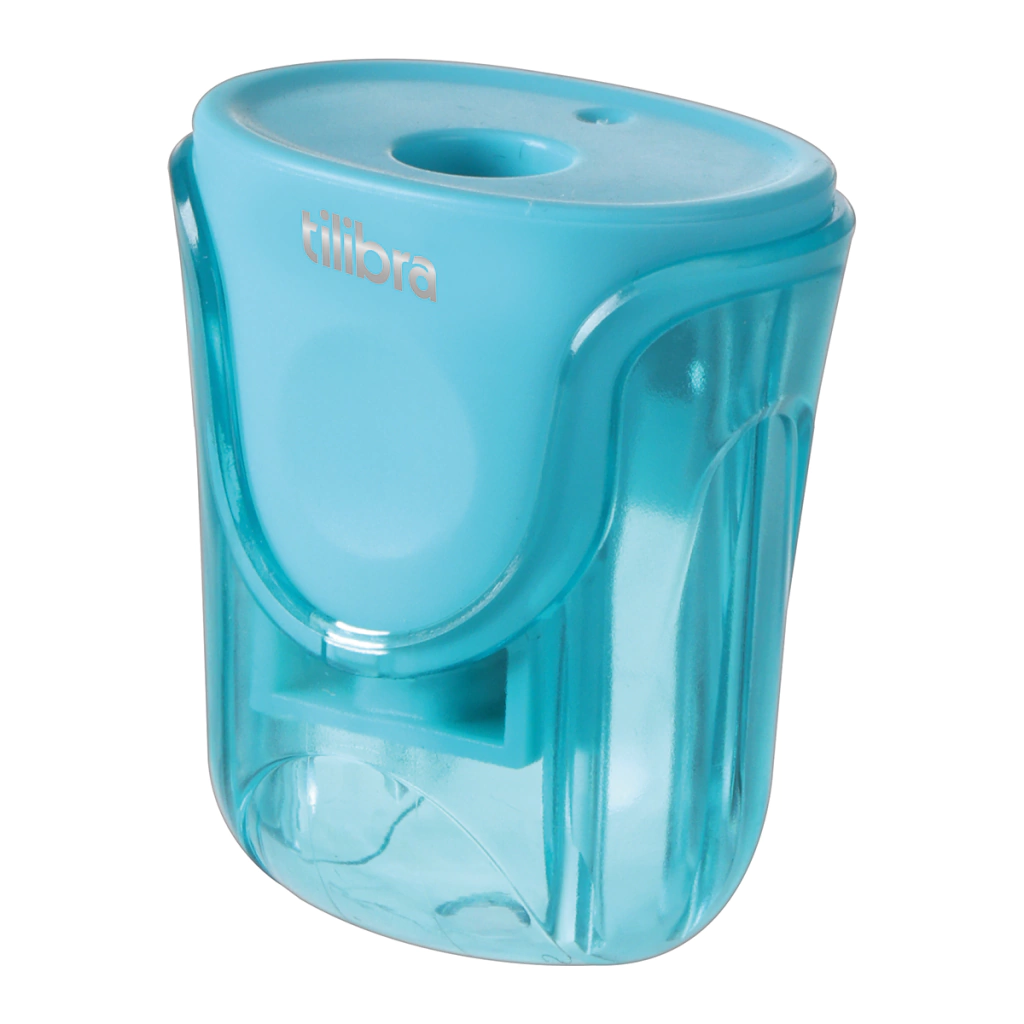 Apontador Duplo com Depósito AP14 Tilibra. Possui um armazenamento espaçoso para resíduos de lápis, com 1 Furo para apontar lápis comum