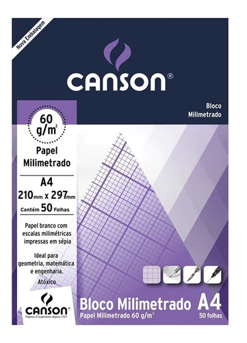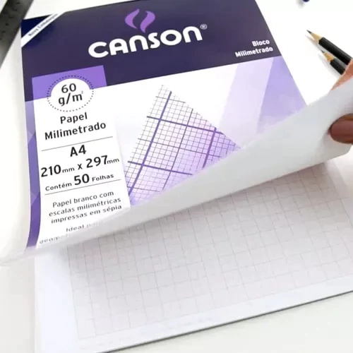 O papel Milimetrado Canson® possui linhas entrecruzadas, separadas por uma distância de 1mm na escala. Estas linhas são utilizadas como guias de desenho, especialmente para o traço de dados experimentais, funções matemáticas ou diagramas. Utilizado em geometria analítica e engenharia.