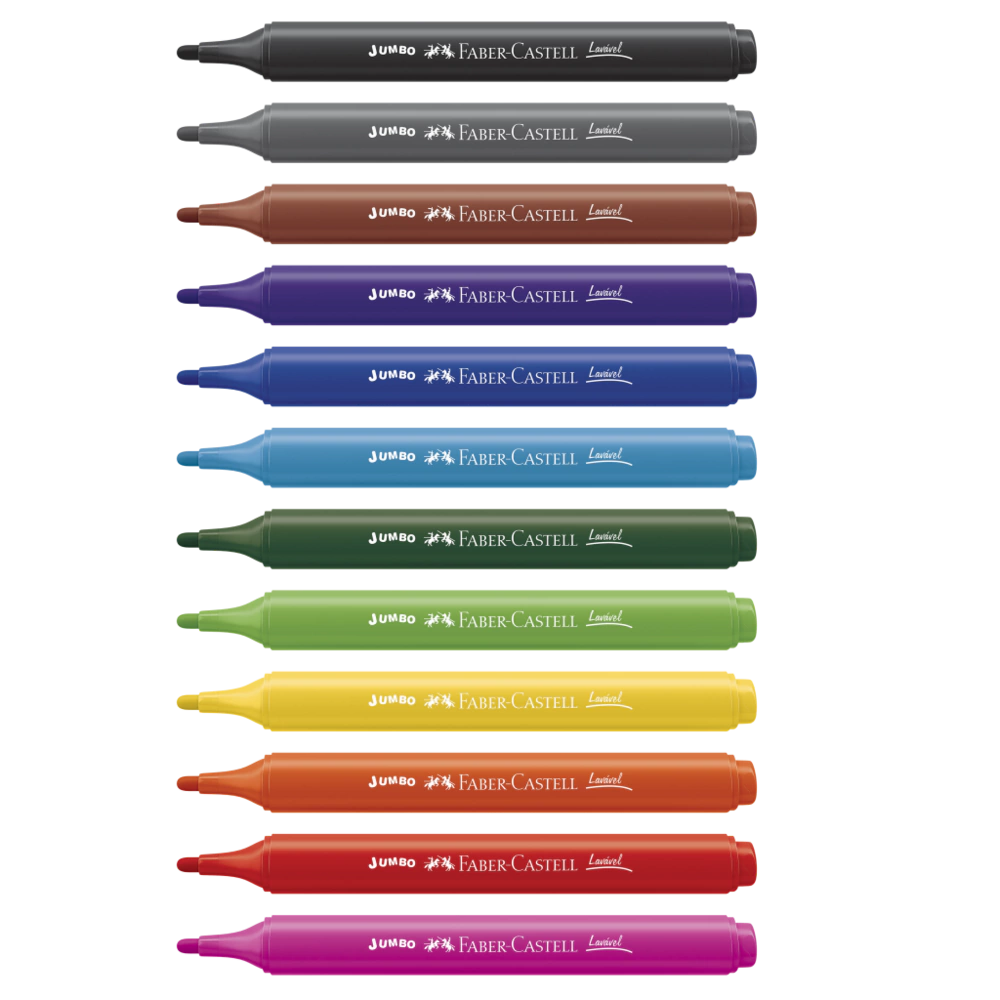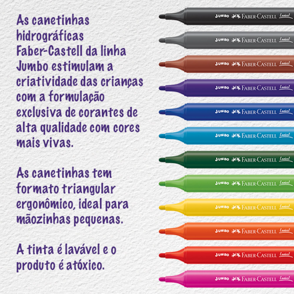 As canetinhas hidrográficas Faber-Castell da linha Jumbo estimulam a criatividade das crianças com a formulação exclusiva de corantes de alta qualidade com cores mais vivas.