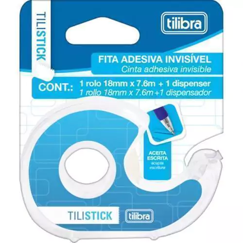 A Fita Adesiva Tilistick é comercializada em rolo de 18 mm x 7 m e possui dispenser reutilizável. O produto tem aplicação invisível e aceita escrita.