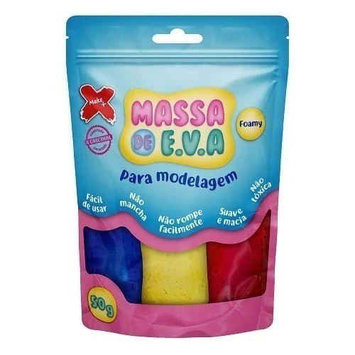 A massa de EVA Make+ é suave, macia e muito flexível. Ela é fácil de usar, não mancha, não rompe facilmente e é totalmente atóxica. Para secar a massa, não é necessário nenhum procedimento extra, basta deixá-la em contato com o ar até endurecer. Solte sua imaginação e crie as mais variadas formas!